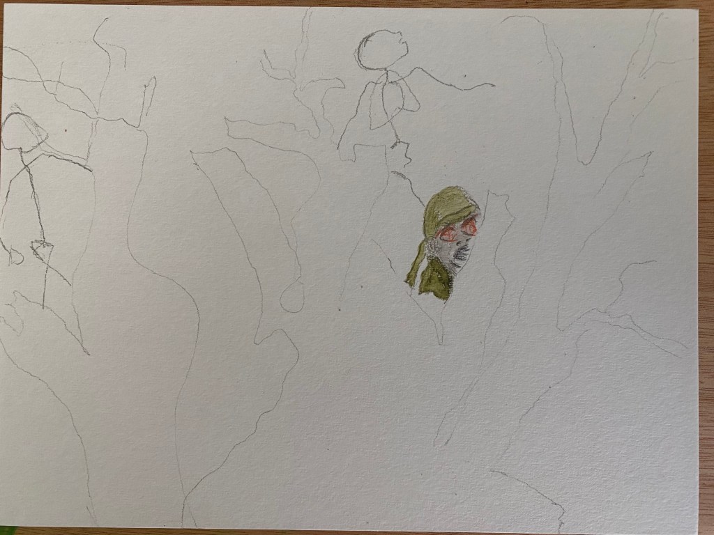 I have the tendency to be melancholic, hyper-empathetic and hyper-sensitive, and dealing with this horrid part of our history as Americans is no different. The way I deal with feelings of despair is either by writing or drawing/painting, or both, and so I am in the planning stages of a series of pieces inspired primarily by John Hersey’s account tentatively titled “Hiroshima, Burning.” Here is a very preliminary sketch: