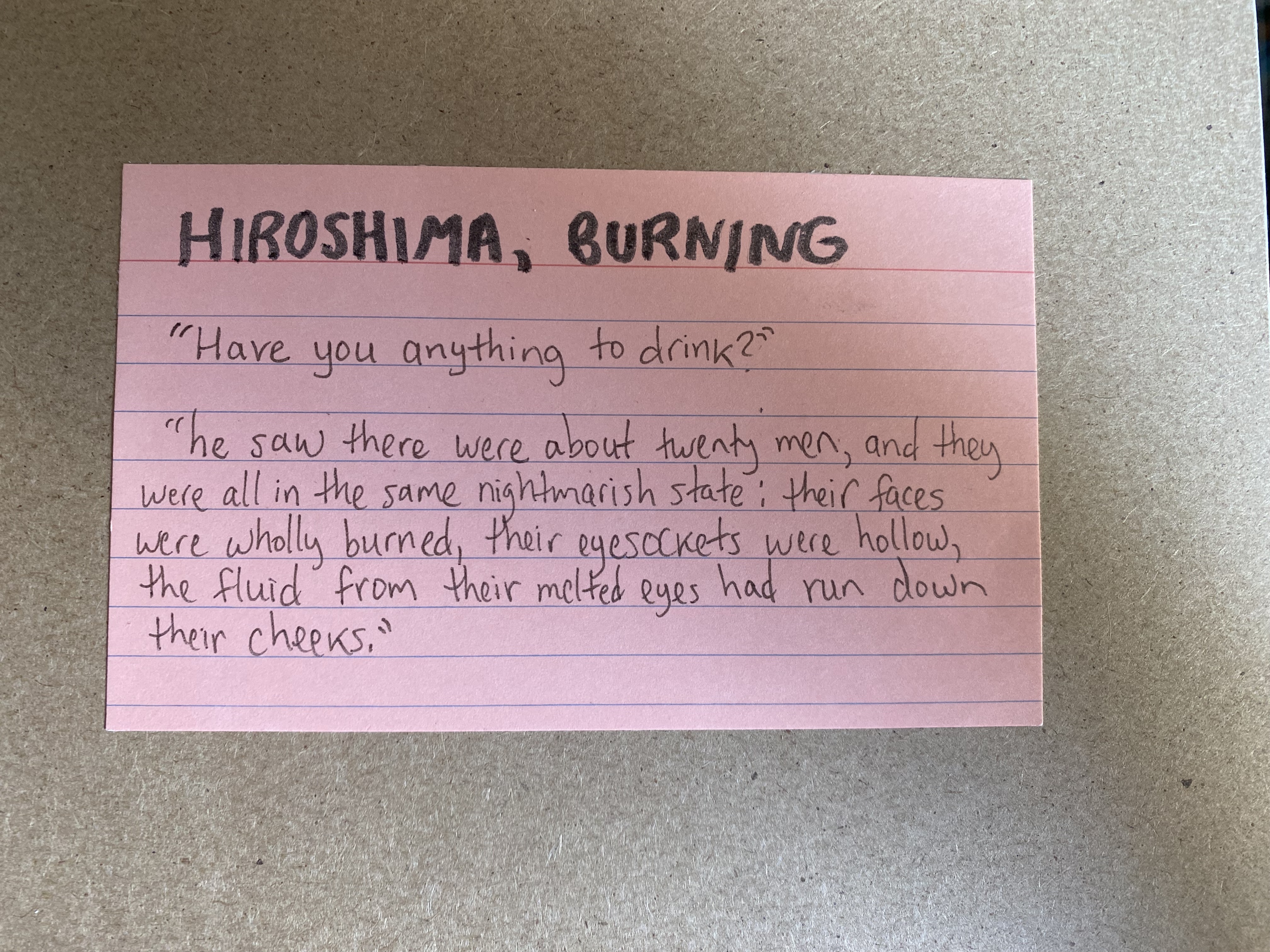 Father Kleinsorge, on his way back from fetching water to help the wounded, heard a voice say, “Have you anything to drink?” And discovered about twenty soldiers in a nightmarish state of faces wholly burned, eyesockets hollowed, and fluid from their melted eyes running down their cheeks. He said their faces must have turned upward when the bomb went off.”